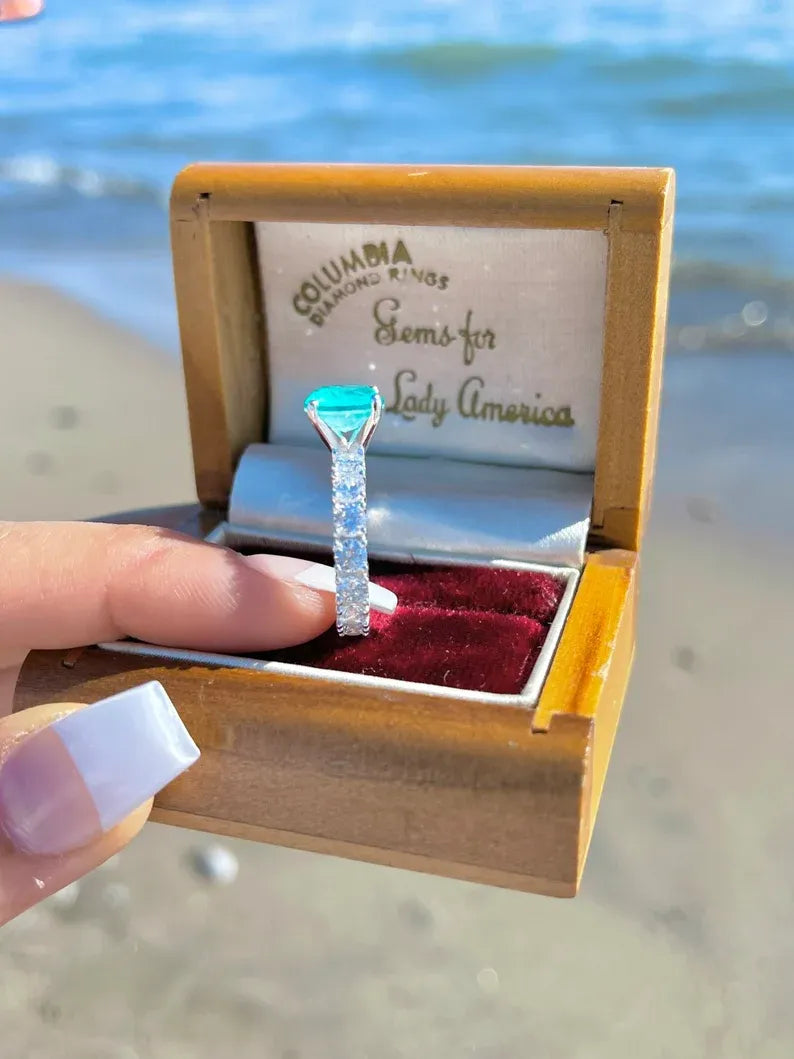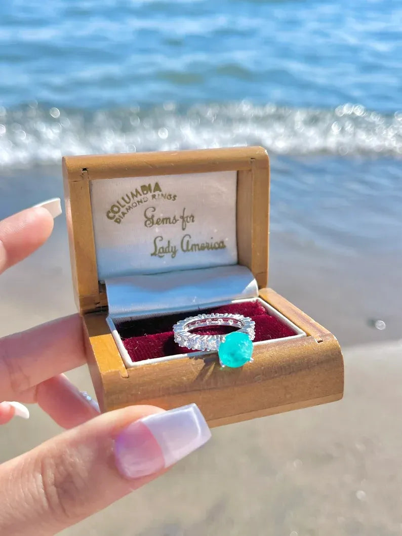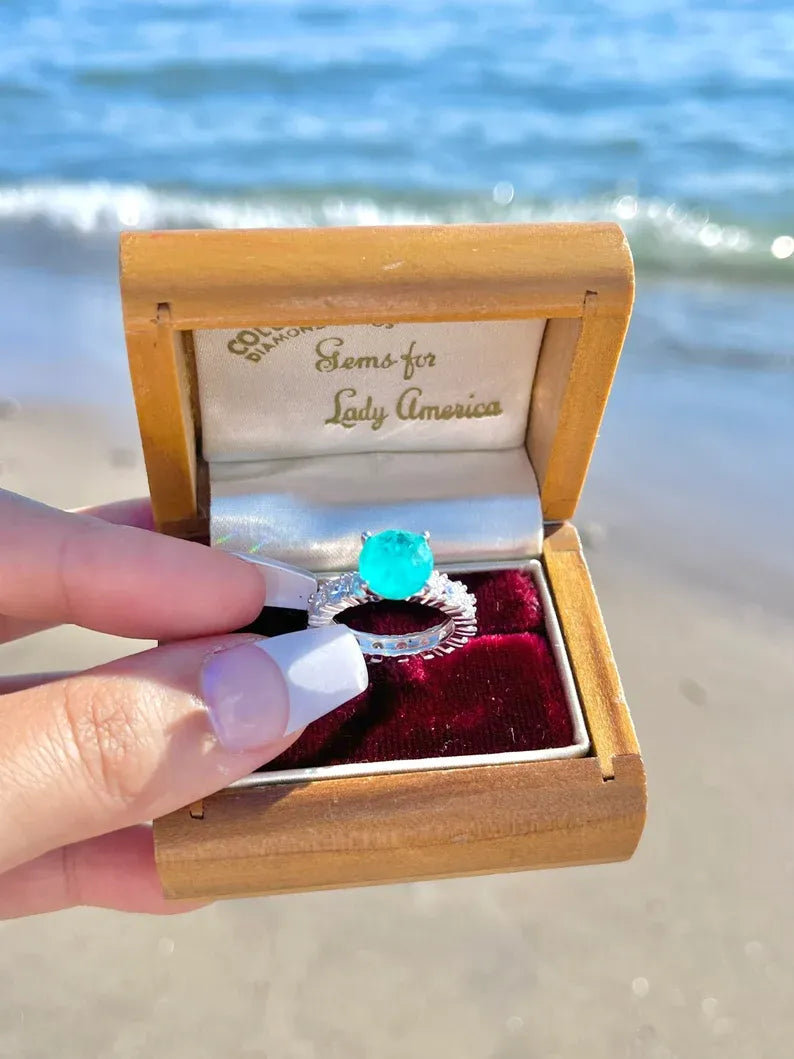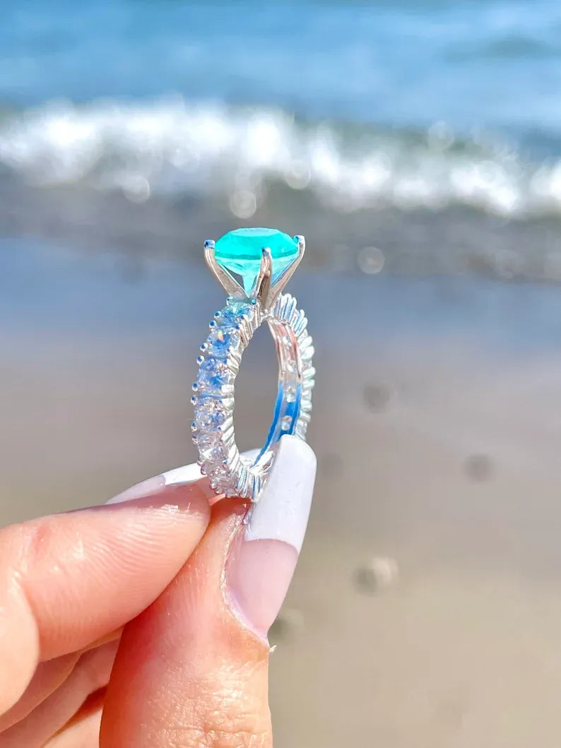 THE GEMSTONE COLOR IS EYE-POPPING WITH A VIBRANT STRONG RICH NEON CARIBBEAN BLUISH GREEN COLOR AND SPARKLE.